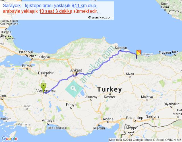 Saraycık - Işıktepe arası yaklaşık olarak 90 km/h ile yukarıda belirtilen sürede olup, iki yerin kuş uçuşu uzaklığı (mesafesi) 651'dir. Eğer belirtilen yerler arasında uçak seferi var ise bu süre uçakla 1 saat 00 dakika'ya kadar düşebilir. Yolculuk otobüsle 13 saat 3 dakika sürmektedir.
