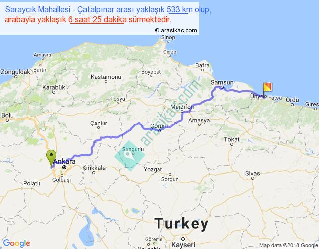 Saraycık Mahallesi - Çatalpınar arası yaklaşık olarak 90 km/h ile yukarıda belirtilen sürede olup, iki yerin kuş uçuşu uzaklığı (mesafesi) 414'dir. Eğer belirtilen yerler arasında uçak seferi var ise bu süre uçakla 38 dakika'ya kadar düşebilir. Yolculuk otobüsle 8 saat 20 dakika sürmektedir.