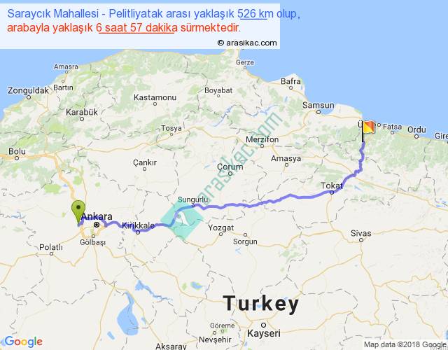 Saraycık Mahallesi - Pelitliyatak arası yaklaşık olarak 90 km/h ile yukarıda belirtilen sürede olup, iki yerin kuş uçuşu uzaklığı (mesafesi) 392'dir. Eğer belirtilen yerler arasında uçak seferi var ise bu süre uçakla 36 dakika'ya kadar düşebilir. Yolculuk otobüsle 9 saat 2 dakika sürmektedir.