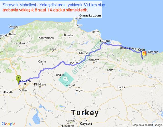 Saraycık Mahallesi - Yokuşdibi arası yaklaşık olarak 90 km/h ile yukarıda belirtilen sürede olup, iki yerin kuş uçuşu uzaklığı (mesafesi) 461'dir. Eğer belirtilen yerler arasında uçak seferi var ise bu süre uçakla 42 dakika'ya kadar düşebilir. Yolculuk otobüsle 10 saat 42 dakika sürmektedir.