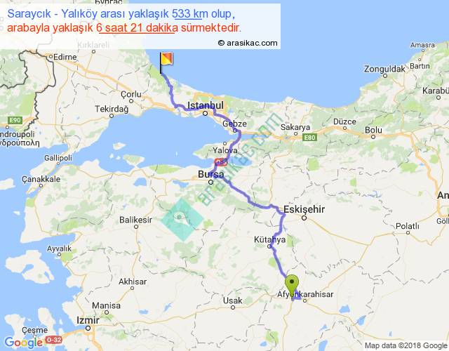 Saraycık - Yalıköy arası yaklaşık olarak 90 km/h ile yukarıda belirtilen sürede olup, iki yerin kuş uçuşu uzaklığı (mesafesi) 345'dir. Eğer belirtilen yerler arasında uçak seferi var ise bu süre uçakla 31 dakika'ya kadar düşebilir. Yolculuk otobüsle 8 saat 15 dakika sürmektedir.