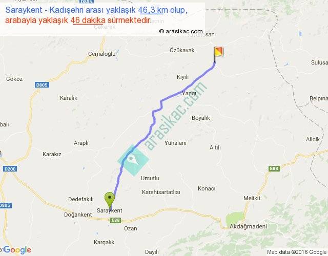 Saraykent - Kadışehri arası yaklaşık olarak 90 km/h ile yukarıda belirtilen sürede olup, iki yerin kuş uçuşu uzaklığı (mesafesi) 41'dir. Yolculuk otobüsle 59 dakika sürmektedir.