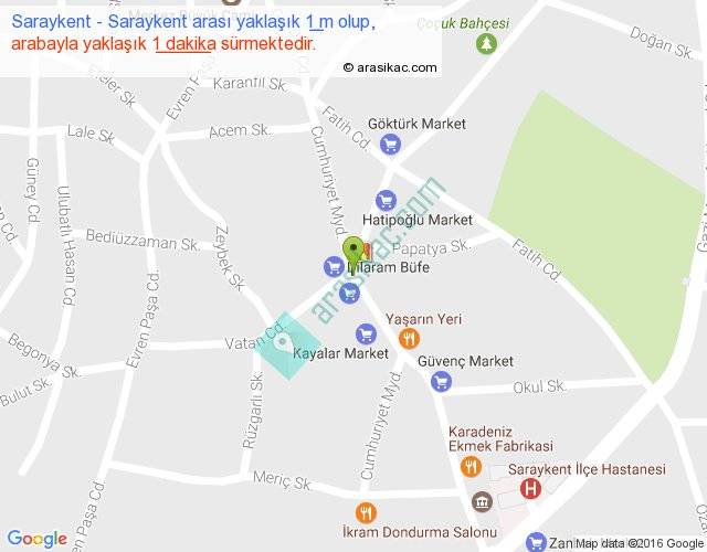Saraykent - Saraykent arası yaklaşık olarak 90 km/h ile yukarıda belirtilen sürede olup, iki yerin kuş uçuşu uzaklığı (mesafesi) 0'dir. Yolculuk otobüsle 1 dakika sürmektedir.