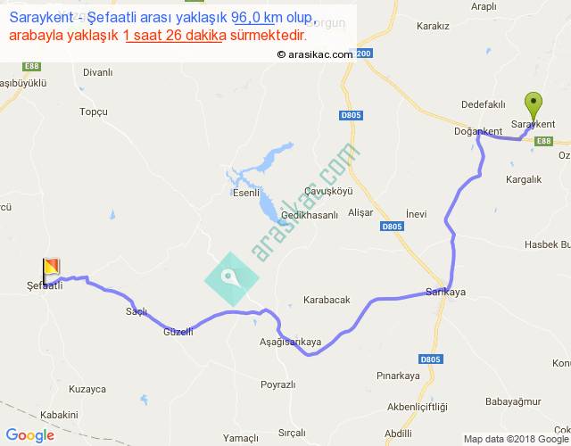 Saraykent - Şefaatli arası yaklaşık olarak 90 km/h ile yukarıda belirtilen sürede olup, iki yerin kuş uçuşu uzaklığı (mesafesi) 67'dir. Yolculuk otobüsle 1 saat 53 dakika sürmektedir.