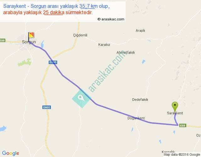 Saraykent - Sorgun arası yaklaşık olarak 90 km/h ile yukarıda belirtilen sürede olup, iki yerin kuş uçuşu uzaklığı (mesafesi) 30'dir. Yolculuk otobüsle 32 dakika sürmektedir.
