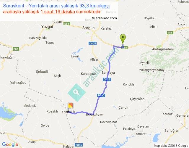 Saraykent - Yenifakılı arası yaklaşık olarak 90 km/h ile yukarıda belirtilen sürede olup, iki yerin kuş uçuşu uzaklığı (mesafesi) 69'dir. Yolculuk otobüsle 1 saat 38 dakika sürmektedir.