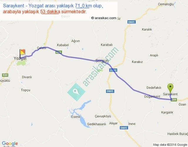Saraykent - Yozgat arası yaklaşık olarak 90 km/h ile yukarıda belirtilen sürede olup, iki yerin kuş uçuşu uzaklığı (mesafesi) 61'dir. Yolculuk otobüsle 1 saat 8 dakika sürmektedir.