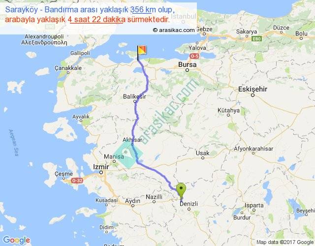 Sarayköy - Bandırma arası yaklaşık olarak 90 km/h ile yukarıda belirtilen sürede olup, iki yerin kuş uçuşu uzaklığı (mesafesi) 281'dir. Eğer belirtilen yerler arasında uçak seferi var ise bu süre uçakla 25 dakika'ya kadar düşebilir. Yolculuk otobüsle 5 saat 40 dakika sürmektedir.