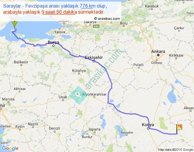 Saraylar - Fevzipaşa arası yaklaşık olarak 90 km/h ile yukarıda belirtilen sürede olup, iki yerin kuş uçuşu uzaklığı (mesafesi) 599'dir. Eğer belirtilen yerler arasında uçak seferi var ise bu süre uçakla 55 dakika'ya kadar düşebilir. Yolculuk otobüsle 12 saat 54 dakika sürmektedir.