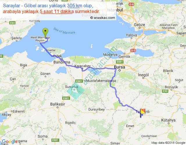 Saraylar - Göbel arası yaklaşık olarak 90 km/h ile yukarıda belirtilen sürede olup, iki yerin kuş uçuşu uzaklığı (mesafesi) 198'dir. Yolculuk otobüsle 6 saat 44 dakika sürmektedir.