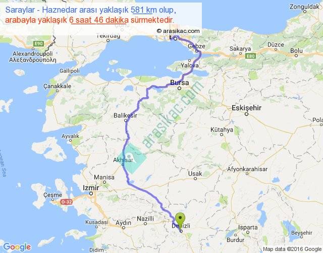 Saraylar - Haznedar arası yaklaşık olarak 90 km/h ile yukarıda belirtilen sürede olup, iki yerin kuş uçuşu uzaklığı (mesafesi) 357'dir. Eğer belirtilen yerler arasında uçak seferi var ise bu süre uçakla 32 dakika'ya kadar düşebilir. Yolculuk otobüsle 8 saat 47 dakika sürmektedir.