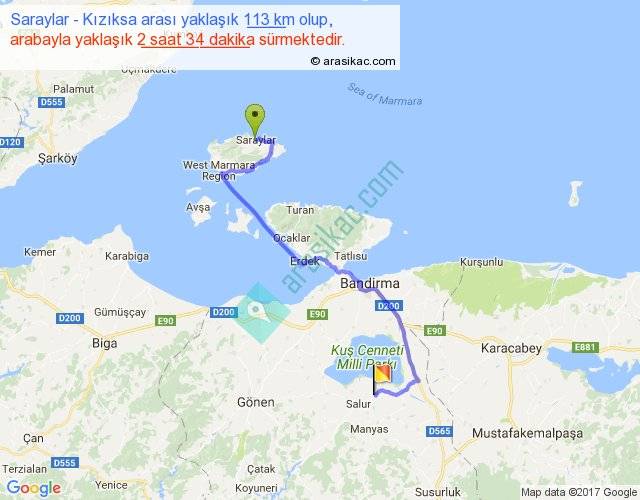 Saraylar - Kızıksa arası yaklaşık olarak 90 km/h ile yukarıda belirtilen sürede olup, iki yerin kuş uçuşu uzaklığı (mesafesi) 65'dir. Yolculuk otobüsle 3 saat 20 dakika sürmektedir.
