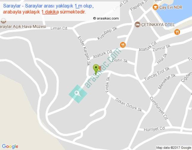 Saraylar - Saraylar arası yaklaşık olarak 90 km/h ile yukarıda belirtilen sürede olup, iki yerin kuş uçuşu uzaklığı (mesafesi) 0'dir. Yolculuk otobüsle 1 dakika sürmektedir.