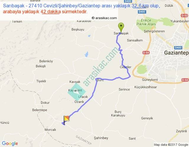 Sarıbaşak - 27410 Cevizli Şahinbey Gaziantep arası yaklaşık olarak 90 km/h ile yukarıda belirtilen sürede olup, iki yerin kuş uçuşu uzaklığı (mesafesi) 22'dir. Yolculuk otobüsle 54 dakika sürmektedir.