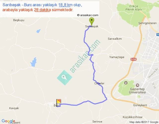 Sarıbaşak - Burc arası yaklaşık olarak 90 km/h ile yukarıda belirtilen sürede olup, iki yerin kuş uçuşu uzaklığı (mesafesi) 11'dir. Yolculuk otobüsle 36 dakika sürmektedir.