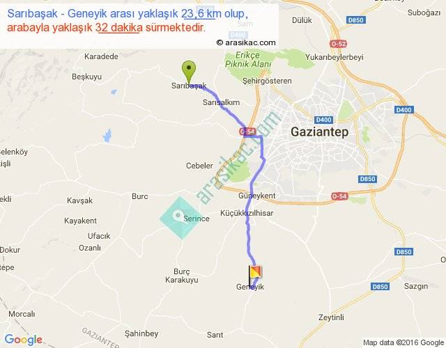Sarıbaşak - Geneyik arası yaklaşık olarak 90 km/h ile yukarıda belirtilen sürede olup, iki yerin kuş uçuşu uzaklığı (mesafesi) 18'dir. Yolculuk otobüsle 41 dakika sürmektedir.