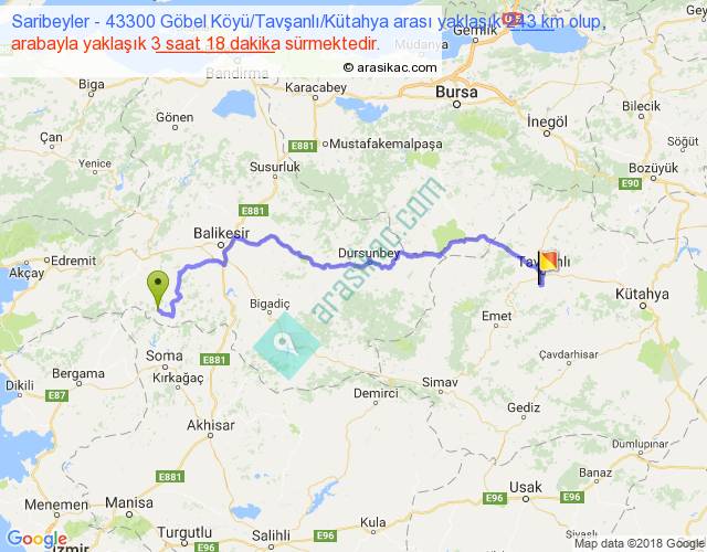 Saribeyler - 43300 Göbel Köyü Tavşanlı Kütahya arası yaklaşık olarak 90 km/h ile yukarıda belirtilen sürede olup, iki yerin kuş uçuşu uzaklığı (mesafesi) 162'dir. Yolculuk otobüsle 4 saat 17 dakika sürmektedir.