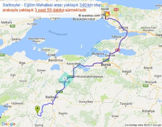 Saribeyler - Eğitim Mahallesi arası yaklaşık olarak 90 km/h ile yukarıda belirtilen sürede olup, iki yerin kuş uçuşu uzaklığı (mesafesi) 215'dir. Yolculuk otobüsle 5 saat 10 dakika sürmektedir.