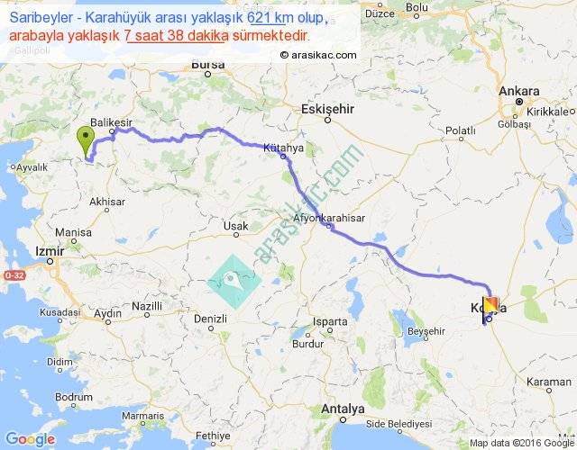 Saribeyler - Karahüyük arası yaklaşık olarak 90 km/h ile yukarıda belirtilen sürede olup, iki yerin kuş uçuşu uzaklığı (mesafesi) 454'dir. Eğer belirtilen yerler arasında uçak seferi var ise bu süre uçakla 41 dakika'ya kadar düşebilir. Yolculuk otobüsle 9 saat 55 dakika sürmektedir.