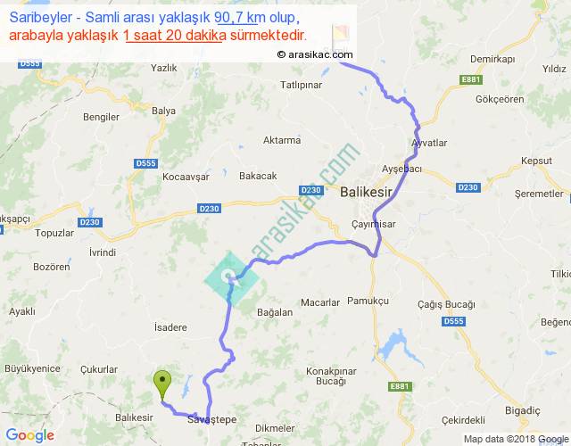 Saribeyler - Samli arası yaklaşık olarak 90 km/h ile yukarıda belirtilen sürede olup, iki yerin kuş uçuşu uzaklığı (mesafesi) 51'dir. Yolculuk otobüsle 1 saat 44 dakika sürmektedir.
