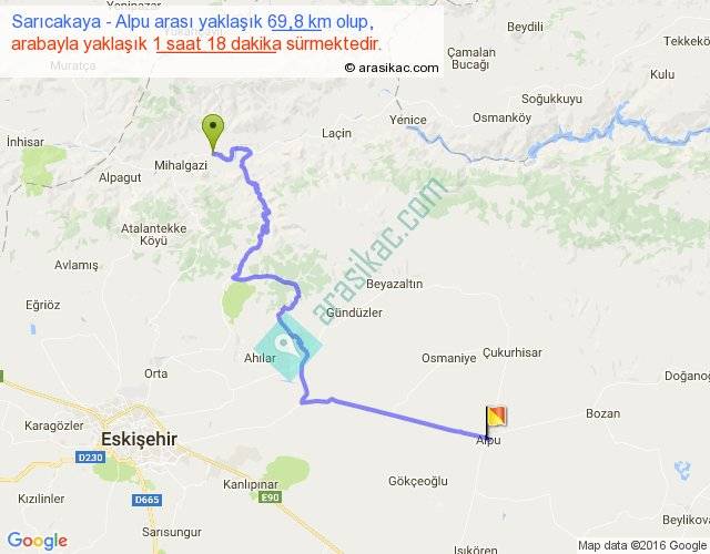 Sarıcakaya - Alpu arası yaklaşık olarak 90 km/h ile yukarıda belirtilen sürede olup, iki yerin kuş uçuşu uzaklığı (mesafesi) 42'dir. Yolculuk otobüsle 1 saat 41 dakika sürmektedir.