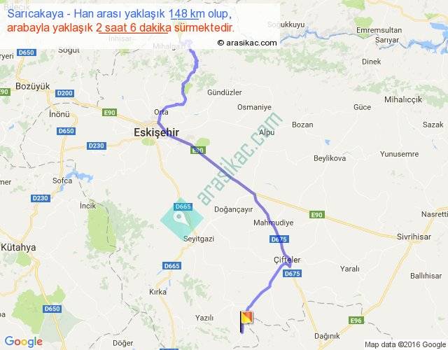 Sarıcakaya - Han arası yaklaşık olarak 90 km/h ile yukarıda belirtilen sürede olup, iki yerin kuş uçuşu uzaklığı (mesafesi) 99'dir. Yolculuk otobüsle 2 saat 43 dakika sürmektedir.