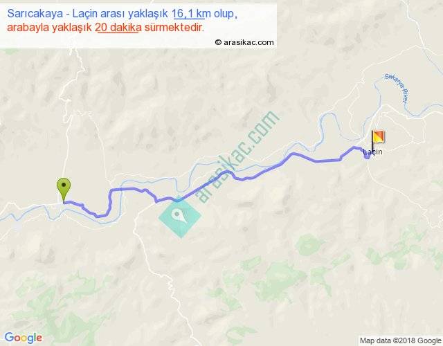 Sarıcakaya - Laçin arası yaklaşık olarak 90 km/h ile yukarıda belirtilen sürede olup, iki yerin kuş uçuşu uzaklığı (mesafesi) 13'dir. Yolculuk otobüsle 24 dakika sürmektedir.