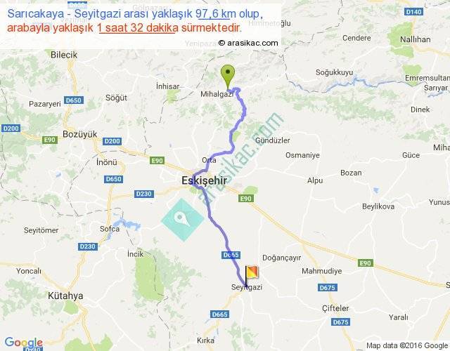 Sarıcakaya - Seyitgazi arası yaklaşık olarak 90 km/h ile yukarıda belirtilen sürede olup, iki yerin kuş uçuşu uzaklığı (mesafesi) 66'dir. Yolculuk otobüsle 1 saat 59 dakika sürmektedir.
