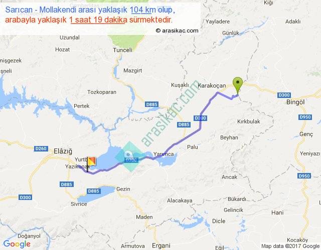 Sarıcan - Mollakendi arası yaklaşık olarak 90 km/h ile yukarıda belirtilen sürede olup, iki yerin kuş uçuşu uzaklığı (mesafesi) 79'dir. Yolculuk otobüsle 1 saat 42 dakika sürmektedir.