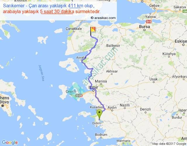 Sarıkemer - Çan arası yaklaşık olarak 90 km/h ile yukarıda belirtilen sürede olup, iki yerin kuş uçuşu uzaklığı (mesafesi) 274'dir. Eğer belirtilen yerler arasında uçak seferi var ise bu süre uçakla 25 dakika'ya kadar düşebilir. Yolculuk otobüsle 7 saat 9 dakika sürmektedir.
