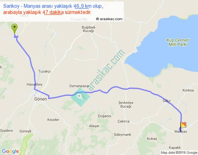 Sarikoy - Manyas arası yaklaşık olarak 90 km/h ile yukarıda belirtilen sürede olup, iki yerin kuş uçuşu uzaklığı (mesafesi) 36'dir. Yolculuk otobüsle 1 saat 1 dakika sürmektedir.