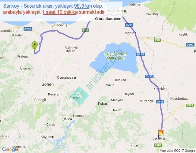 Sarikoy - Susurluk arası yaklaşık olarak 90 km/h ile yukarıda belirtilen sürede olup, iki yerin kuş uçuşu uzaklığı (mesafesi) 57'dir. Yolculuk otobüsle 1 saat 42 dakika sürmektedir.