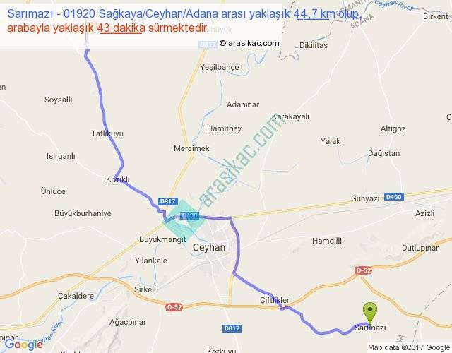 Sarımazı - 01920 Sağkaya Ceyhan Adana arası yaklaşık olarak 90 km/h ile yukarıda belirtilen sürede olup, iki yerin kuş uçuşu uzaklığı (mesafesi) 34'dir. Yolculuk otobüsle 55 dakika sürmektedir.