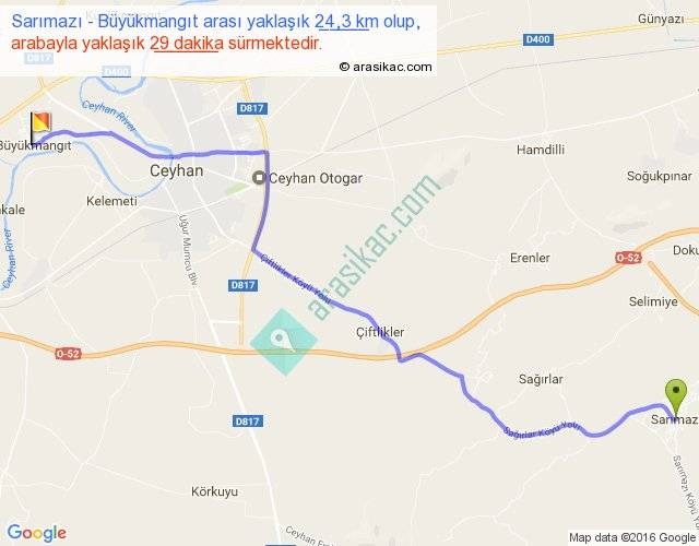 Sarımazı - Büyükmangıt arası yaklaşık olarak 90 km/h ile yukarıda belirtilen sürede olup, iki yerin kuş uçuşu uzaklığı (mesafesi) 19'dir. Yolculuk otobüsle 37 dakika sürmektedir.