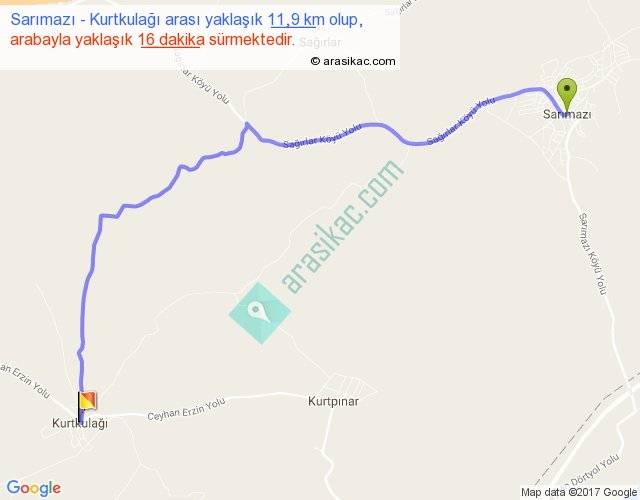 Sarımazı - Kurtkulağı arası yaklaşık olarak 90 km/h ile yukarıda belirtilen sürede olup, iki yerin kuş uçuşu uzaklığı (mesafesi) 9'dir. Yolculuk otobüsle 20 dakika sürmektedir.