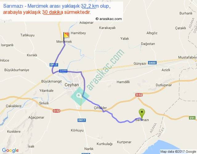 Sarımazı - Mercimek arası yaklaşık olarak 90 km/h ile yukarıda belirtilen sürede olup, iki yerin kuş uçuşu uzaklığı (mesafesi) 22'dir. Yolculuk otobüsle 39 dakika sürmektedir.
