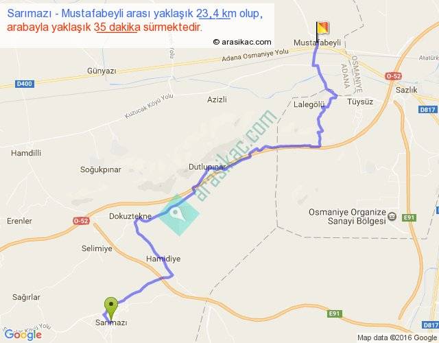 Sarımazı - Mustafabeyli arası yaklaşık olarak 90 km/h ile yukarıda belirtilen sürede olup, iki yerin kuş uçuşu uzaklığı (mesafesi) 15'dir. Yolculuk otobüsle 45 dakika sürmektedir.