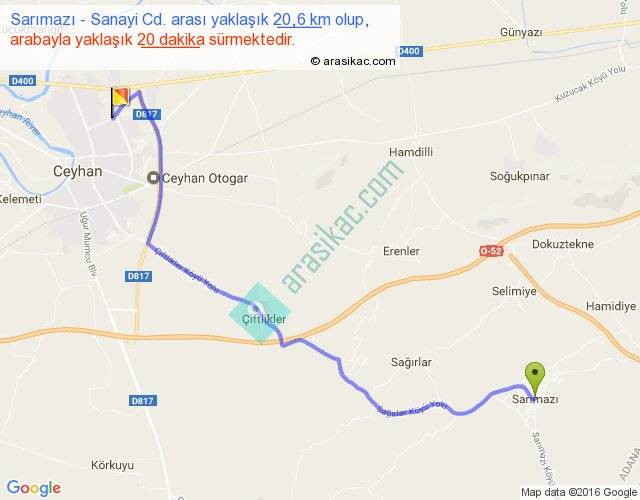 Sarımazı - Sanayi Cd. arası yaklaşık olarak 90 km/h ile yukarıda belirtilen sürede olup, iki yerin kuş uçuşu uzaklığı (mesafesi) 15'dir. Yolculuk otobüsle 26 dakika sürmektedir.