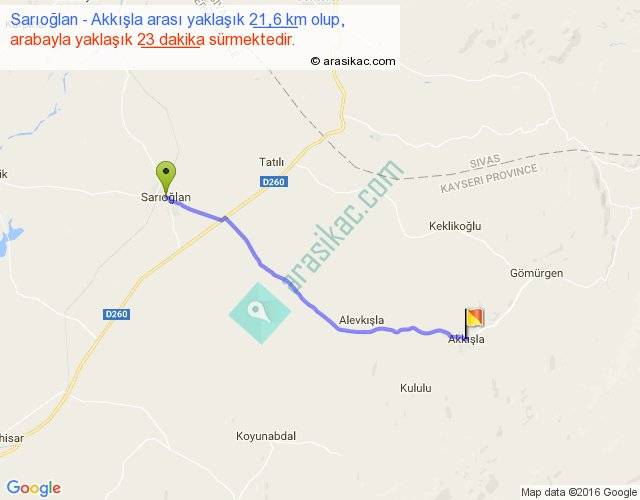 Sarıoğlan - Akkışla arası yaklaşık olarak 90 km/h ile yukarıda belirtilen sürede olup, iki yerin kuş uçuşu uzaklığı (mesafesi) 20'dir. Yolculuk otobüsle 29 dakika sürmektedir.