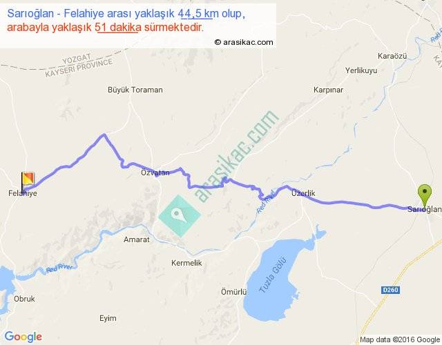 Sarıoğlan - Felahiye arası yaklaşık olarak 90 km/h ile yukarıda belirtilen sürede olup, iki yerin kuş uçuşu uzaklığı (mesafesi) 34'dir. Yolculuk otobüsle 1 saat 6 dakika sürmektedir.