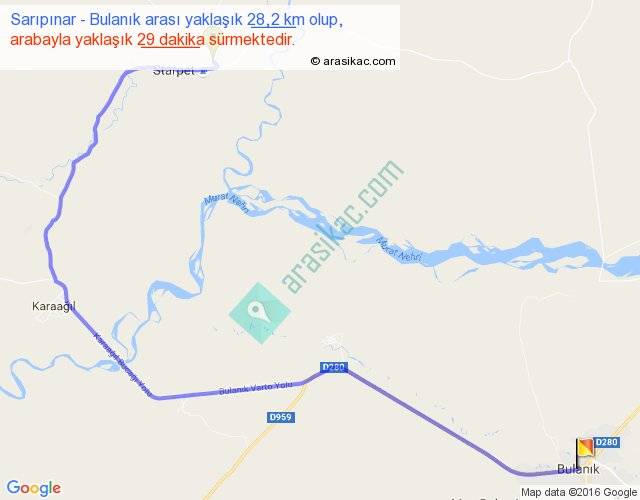 Sarıpınar - Bulanık arası yaklaşık olarak 90 km/h ile yukarıda belirtilen sürede olup, iki yerin kuş uçuşu uzaklığı (mesafesi) 16'dir. Yolculuk otobüsle 37 dakika sürmektedir.