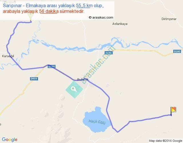 Sarıpınar - Elmakaya arası yaklaşık olarak 90 km/h ile yukarıda belirtilen sürede olup, iki yerin kuş uçuşu uzaklığı (mesafesi) 35'dir. Yolculuk otobüsle 1 saat 12 dakika sürmektedir.
