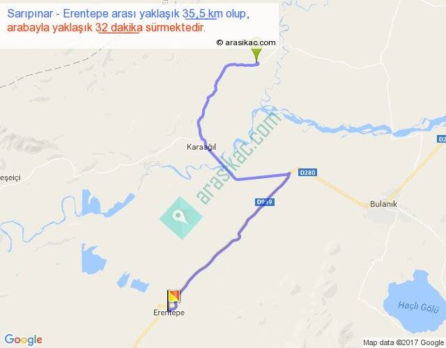 Sarıpınar - Erentepe arası yaklaşık olarak 90 km/h ile yukarıda belirtilen sürede olup, iki yerin kuş uçuşu uzaklığı (mesafesi) 22'dir. Yolculuk otobüsle 41 dakika sürmektedir.