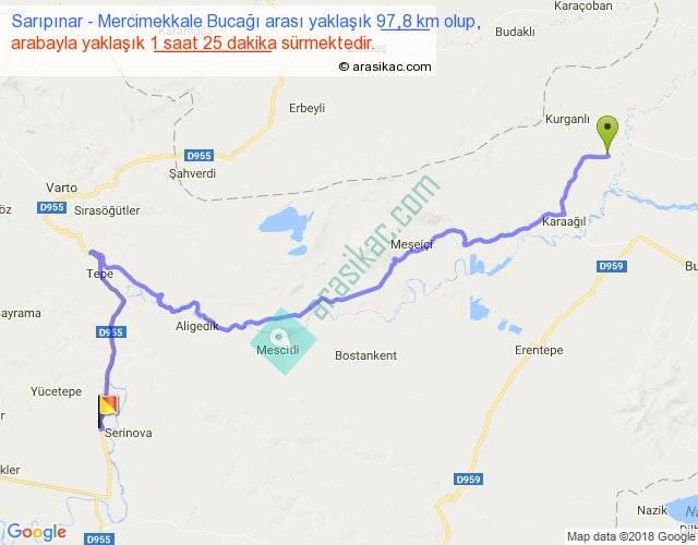 Sarıpınar - Mercimekkale Bucağı arası yaklaşık olarak 90 km/h ile yukarıda belirtilen sürede olup, iki yerin kuş uçuşu uzaklığı (mesafesi) 62'dir. Yolculuk otobüsle 1 saat 50 dakika sürmektedir.