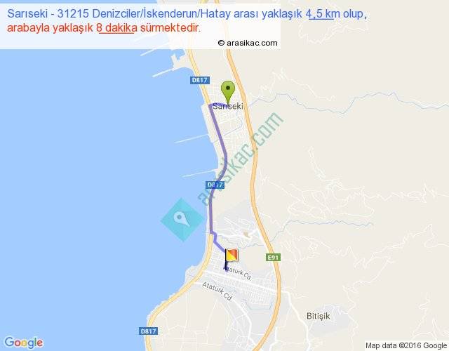 Sarıseki - 31215 Denizciler İskenderun Hatay arası yaklaşık olarak 90 km/h ile yukarıda belirtilen sürede olup, iki yerin kuş uçuşu uzaklığı (mesafesi) 4'dir. Yolculuk otobüsle 10 dakika sürmektedir.
