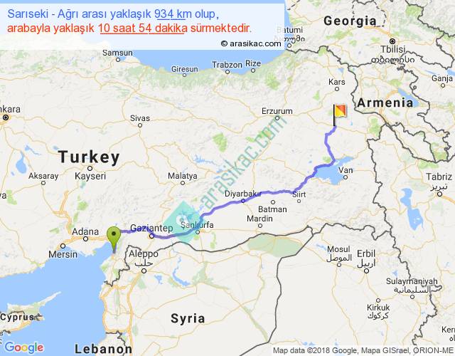 Sarıseki - Ağrı arası yaklaşık olarak 90 km/h ile yukarıda belirtilen sürede olup, iki yerin kuş uçuşu uzaklığı (mesafesi) 682'dir. Eğer belirtilen yerler arasında uçak seferi var ise bu süre uçakla 1 saat 02 dakika'ya kadar düşebilir. Yolculuk otobüsle 14 saat 10 dakika sürmektedir.