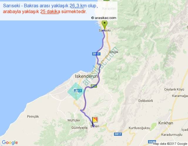 Sarıseki - Bakras arası yaklaşık olarak 90 km/h ile yukarıda belirtilen sürede olup, iki yerin kuş uçuşu uzaklığı (mesafesi) 20'dir. Yolculuk otobüsle 32 dakika sürmektedir.