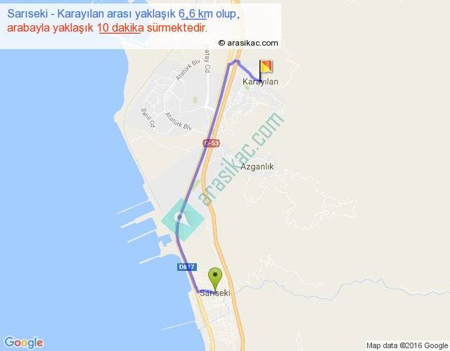 Sarıseki - Karayılan arası yaklaşık olarak 90 km/h ile yukarıda belirtilen sürede olup, iki yerin kuş uçuşu uzaklığı (mesafesi) 5'dir. Yolculuk otobüsle 13 dakika sürmektedir.