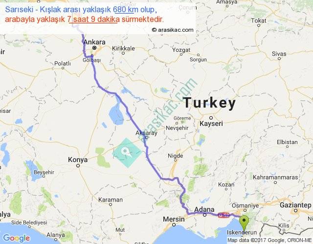 Sarıseki - Kışlak arası yaklaşık olarak 90 km/h ile yukarıda belirtilen sürede olup, iki yerin kuş uçuşu uzaklığı (mesafesi) 520'dir. Eğer belirtilen yerler arasında uçak seferi var ise bu süre uçakla 48 dakika'ya kadar düşebilir. Yolculuk otobüsle 9 saat 17 dakika sürmektedir.