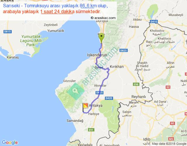 Sarıseki - Tomruksuyu arası yaklaşık olarak 90 km/h ile yukarıda belirtilen sürede olup, iki yerin kuş uçuşu uzaklığı (mesafesi) 59'dir. Yolculuk otobüsle 1 saat 49 dakika sürmektedir.